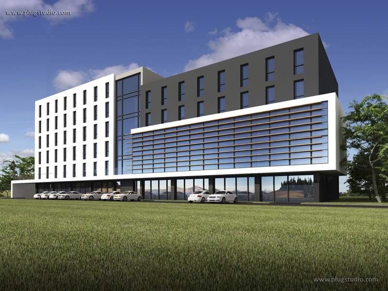 Projekt nowoczesnego hotelu serii DH. Wewnątrz przestrzeń, którą można podzielić na wiele sposobów. W zależności od potrzeb klienta można wydzielić pomieszczenia o różnej wielkości. Budynek posiada opcję garażu podziemnego. Dostępne inne wersje, różniące się elewacją oraz wysokością i szarokością budynków.