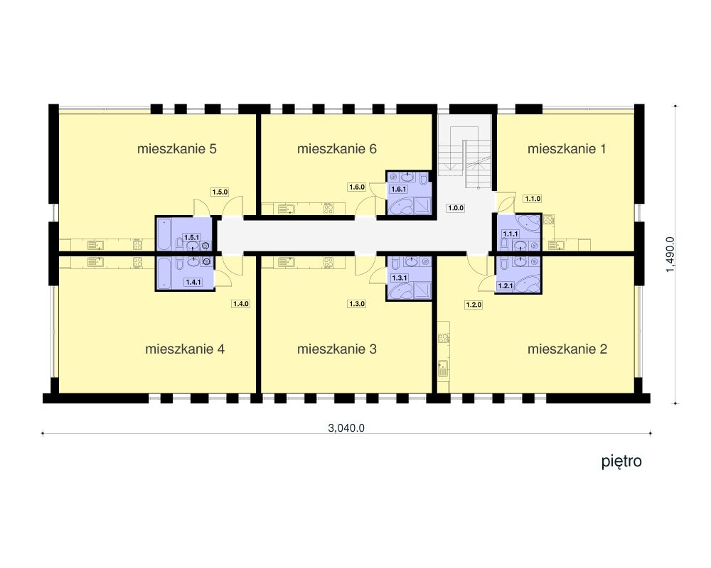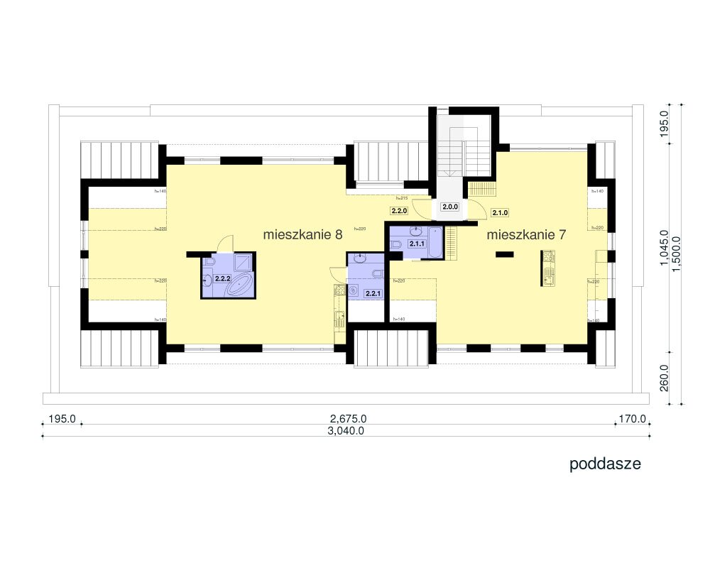 Projekt nowoczesnego budynku wielorodzinnego. Na parterze zaprojektowano część usługową, natomiast na piętrze i poddaszu - mieszkania. Mieszkania na piętrze mają od 40 do 60m2 i są zaprojektowane w sposób pozwalający na ich dowolny podział. Natomaist na poddaszu przewidziane są dwa większe mieszkania po 77m2 i 110 m2.