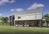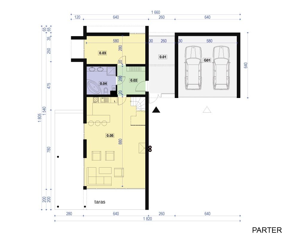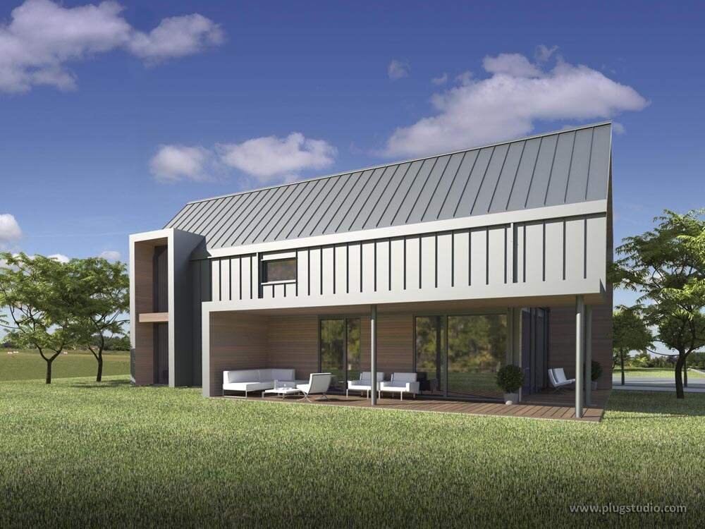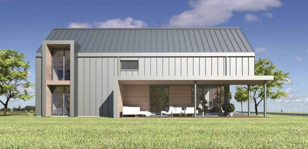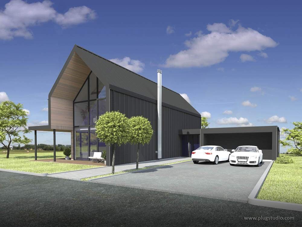 Projekt tzw. "nowoczesnej stodoły" - dom jednorodzinny z dachem dwuspadowym. Wysokość 8.30 m, dostępne są również wersje 7.60 lub 6.20 m. Na parterze otwarta przestrzeń salonu z kuchnią, dobrze doświetlona poprzez szklaną scianę od strony tarasu. Na piętrze zaprojektowano 3 pokoje, łazienkę i wc. Ta wersja posiada również garaż na dwa samochody. W ofercie mamy dostępne różne wersje, w zależności od usytuowania budynku względem stron świata - salon z tarasem może być zlokalizowany od strony wejścia, jak w tym projekcie, albo z tyłu domu. Garaż jest częsią ruchomą, może być osobno lub połączony z budynkiem stodoły. Projekty różnią się wielkością, ich szerokość pozostaje taka sama, możemy dodać kolejne moduły - wtedy budynek będzie dłuższy.