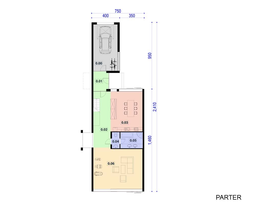 Budynek stanowi zewnętrzny moduł w zabudowie szeregowej serii PS-AL, z garażem. Prosta i nowoczesna bryła budynku idealnie wpisze się w każde otoczenie.