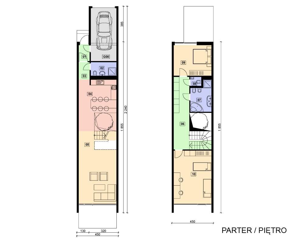 Moduł w zabudowie szeregowej serii LONGER z garażem. Minimalna szerokość działki to zaledwie 4.5 m, dzięki czemu idealnie sprawdzi się na działkach długich i wąskich. Projekt pozwala na uzyskanie bardzo wysokiej intensywności zabudowy. Dysponujemy całym systemem tego typu projektów dla szerokości działek 4.0-12.0m i głębokości 8.0-26.0m.