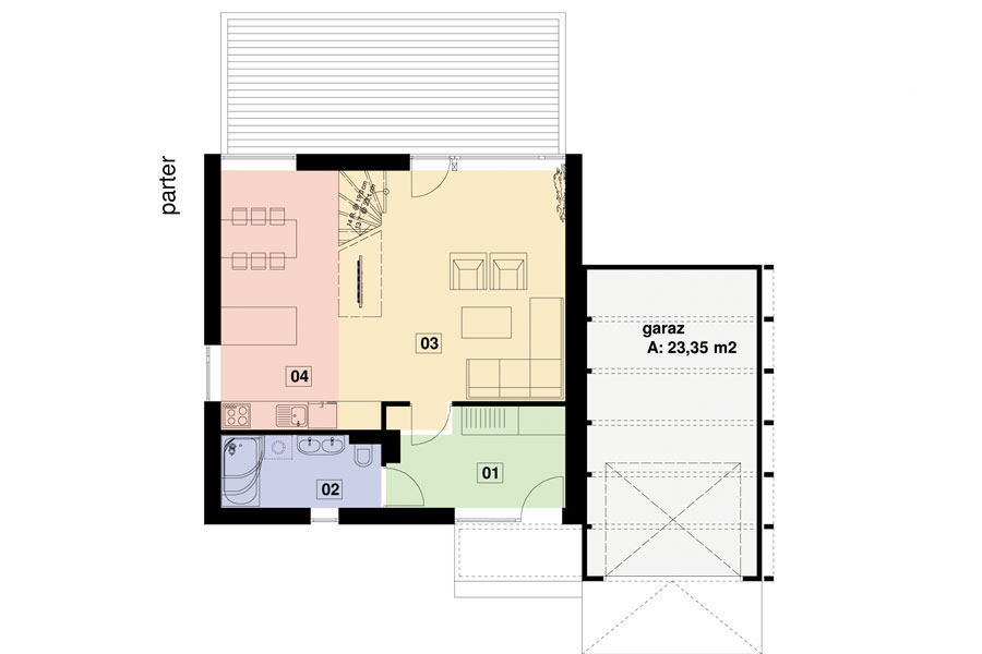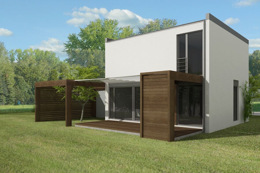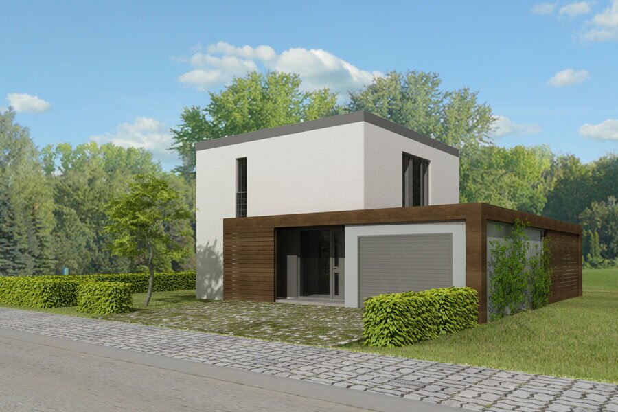 PS-MN-48-20 o jeden z budynków serii MN o bardzo nowoczesnej formie i bardzo dobrych parametrach cieplnych oraz tani w budowie. Zaprojektowaliśmy go z myślą o młodych ludziach potrzebujących nowego wygodnego domu za niewielkie pieniądze. Parter składa się z salonu z otwartą kuchnią połączoną z jadalnią, wygodnej łazienki z piecem akumulacyjnym i wiatrołapu. Na piętrze znajdują się trzy sypialnie i druga łazienka. Budynek spełnia w pełni wymagania młodej rodziny 2+(1-3) na minimalnej powierzchni. Ściany w systemie pustaka lub betonu komórkowego 18 cm, ocieplenie 15 cm styropianem lub wełną mineralną, dach płaski z membraną Firestone.