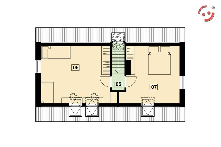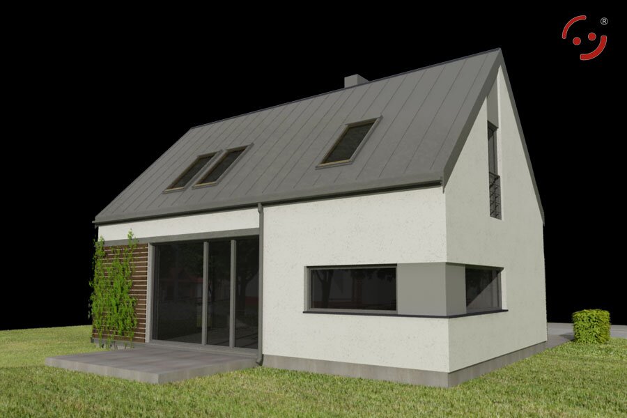 Mały, bardzo funkcjonalny i oszczędny dom parterowy z poddaszem użytkowym. Przeznaczony dla 2-4-osobowej rodziny. Parter to salon z kuchnią oraz łazienka. W salonie znajduje się kominek. Na poddaszu znajdują się dwie sypialnie. Wizualizacje: Rzuty: