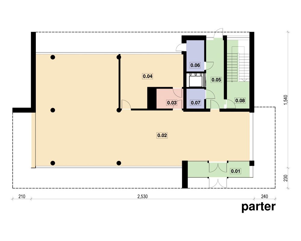 Projekt budynku usługowego - biurowego, do dowolnej adaptacji na odpowiednią funkcję w zależności od potrzeb klienta. System konstrukcyjny pozwala na dowolny podział pomieszczeń. Budynek idealnie nadaje się do zabudowy w aglomeracji miejskiej, jak również na obrzeżach miast, przy halach fabrycznych. Dostępne różne wersje budynku, także z garażem oraz możliwoscią dostawienia do istniejących hal fabrycznych, produkcyjnych, czy magazynowych.