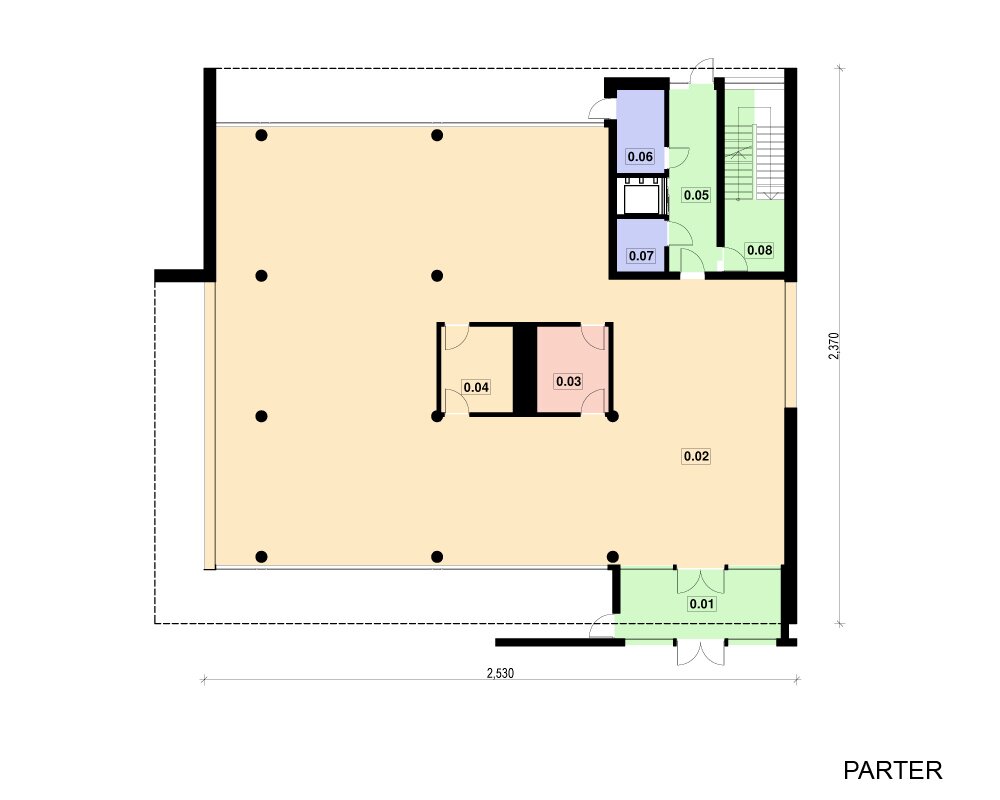 Projekt budynku usługowego - biurowego, do dowolnej adaptacji na odpowiednią funkcję w zależności od potrzeb klienta. System konstrukcyjny pozwala na dowolny podział pomieszczeń. Budynek idealnie nadaje się do zabudowy w aglomeracji miejskiej, jak również na obrzeżach miast, przy halach fabrycznych. Dostępne różne wersje budynku, także z garażem oraz możliwoscią dostawienia do istniejących hal fabrycznych, produkcyjnych, czy magazynowych.