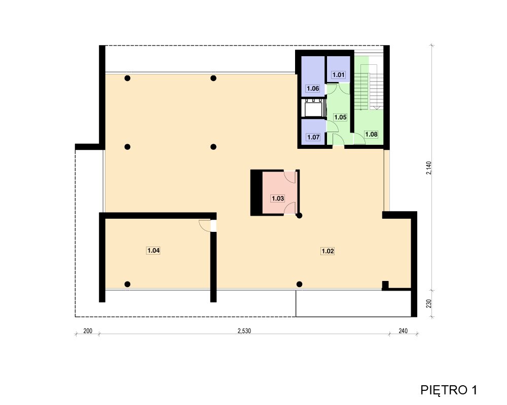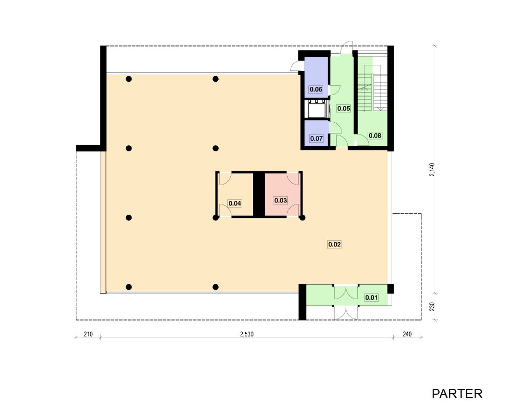 Projekt budynku usługowego - biurowego, do dowolnej adaptacji na odpowiednią funkcję w zależności od potrzeb klienta. System konstrukcyjny pozwala na dowolny podział pomieszczeń. Budynek idealnie nadaje się do zabudowy w aglomeracji miejskiej, jak również na obrzeżach miast, przy halach fabrycznych. Dostępne różne wersje budynku, także z garażem oraz możliwoscią dostawienia do istniejących hal fabrycznych, produkcyjnych, czy magazynowych.