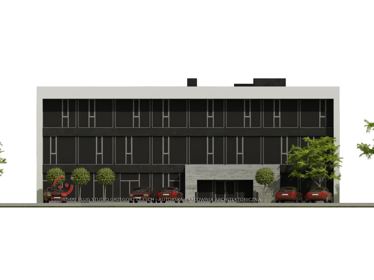 Projekt budynku biurowego lub usługowego z garażem podziemnym.