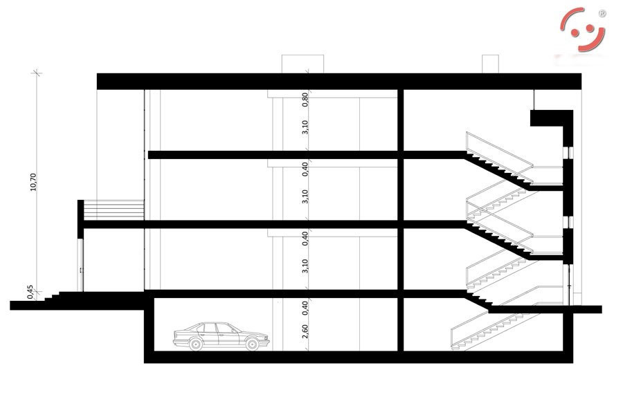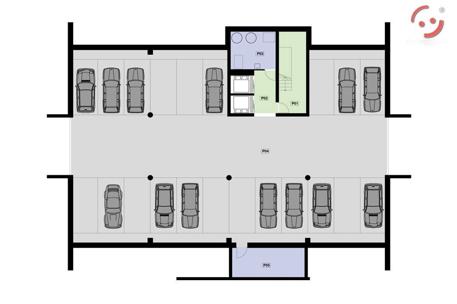 Projekt budynku biurowego lub usługowego z garażem podziemnym.