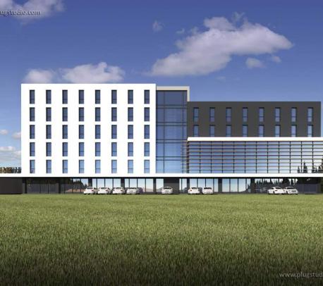 Projekt nowoczesnego hotelu serii DH. Wewnątrz przestrzeń, którą można podzielić na wiele sposobów. W zależności od potrzeb klienta można wydzielić pomieszczenia o różnej wielkości. Budynek posiada opcję garażu podziemnego. Dostępne inne wersje, różniące się elewacją oraz wysokością i szarokością budynków.