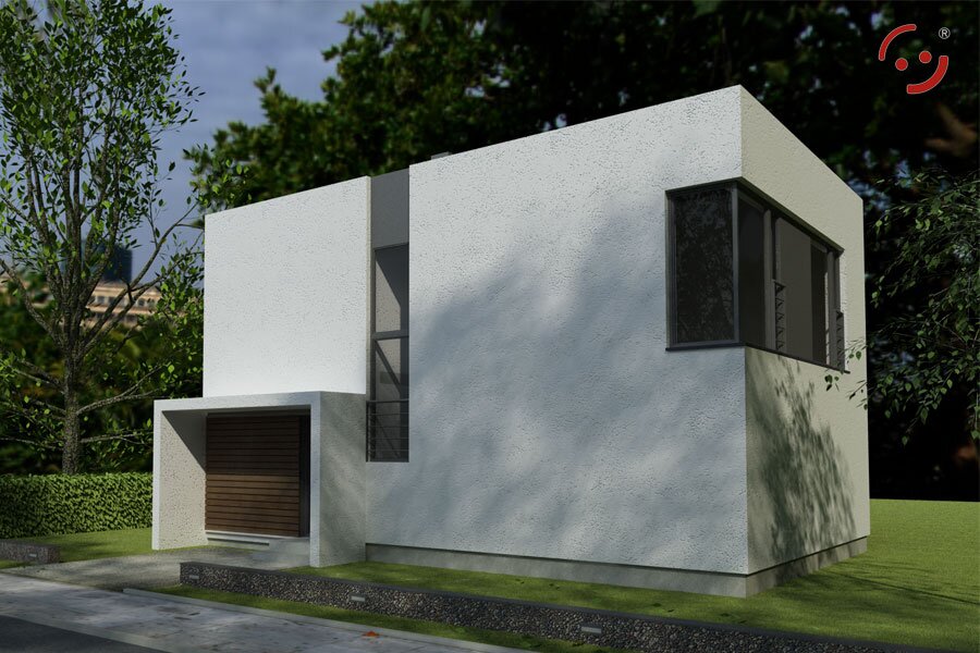 Mały bardzo funkcjonalny i oszczędny dom piętrowy. Przeznaczony dla 3-5-osobowej rodziny. Parter to salon z kuchnią oraz łazienka. W salonie znajduje się kominek. Na piętrze znajdują się trzy sypialnie.