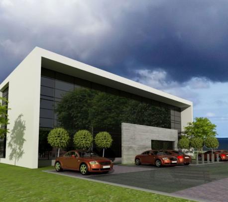 Projekt budynku biurowego lub usługowego z garażem podziemnym.
