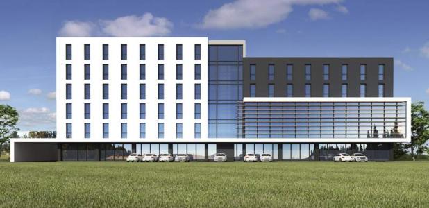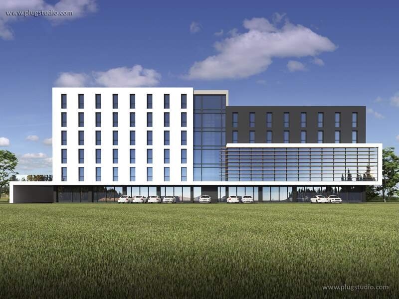 Projekt nowoczesnego hotelu serii DH. Wewnątrz przestrzeń, którą można podzielić na wiele sposobów. W zależności od potrzeb klienta można wydzielić pomieszczenia o różnej wielkości. Budynek posiada opcję garażu podziemnego. Dostępne inne wersje, różniące się elewacją oraz wysokością i szarokością budynków.