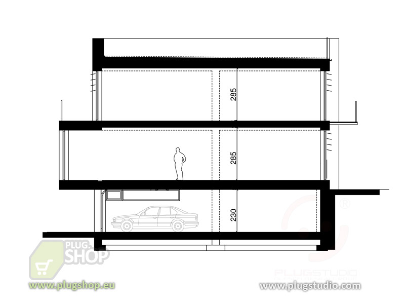 Budynek w poziomie parteru posiada jedynie ogromny garaż, kotłownię i wejście na klatkę schodową. 1 i 2 piętro to otwarte mieszkania z możliwością dowolnego zlokalizowania łazienki i kuchni w otwartej przestrzeni. Każdy lokal można dowolnie podzielić na 2-4 pokoi. Na dachu budynku znajduje się ogród.