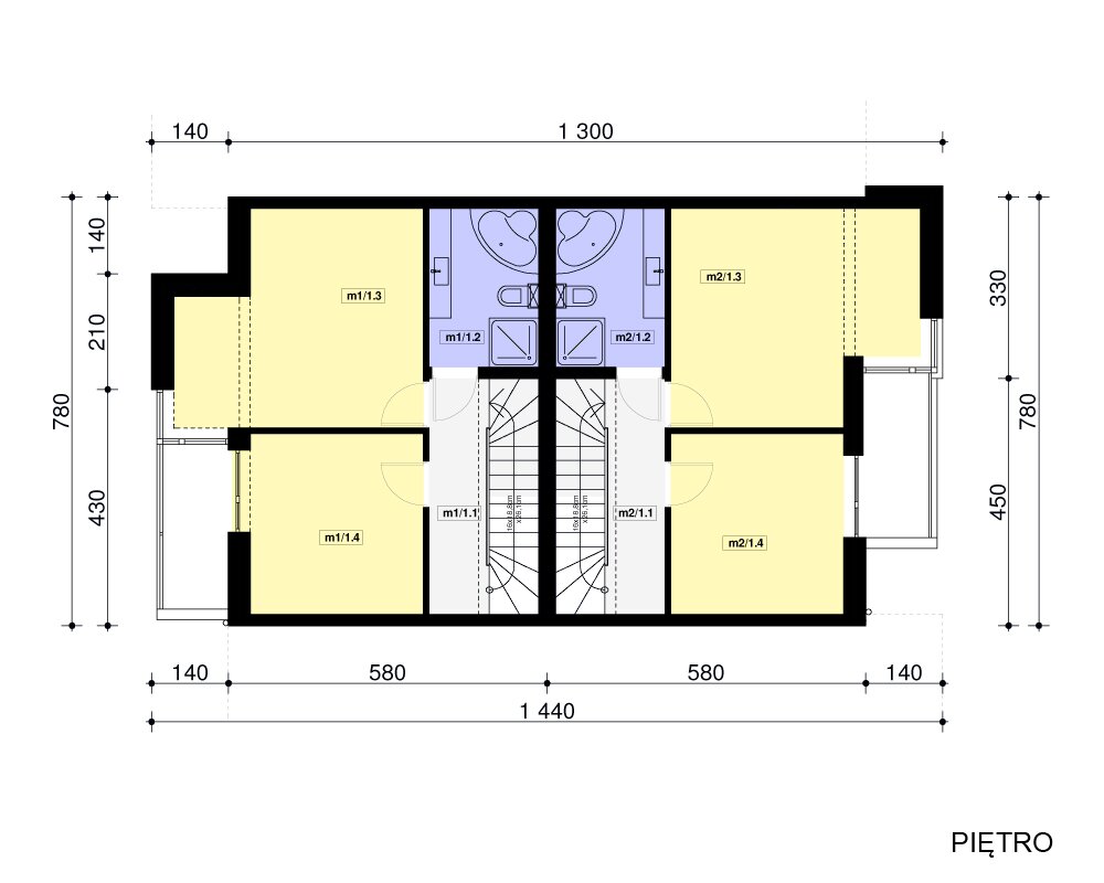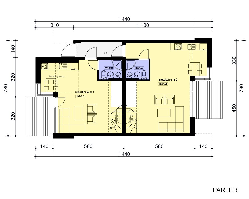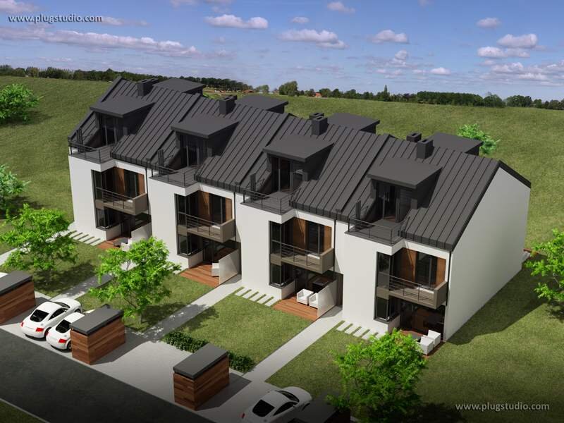 Budynek stanowi wewnętrzny moduł w zabudowie szeregowej serii PS-LO. Dwa mieszkania 92,13m2 i 99,44m2. Możliwość dopasowania różnych wariantów w zależności od zestawienia modułów oraz odpowiednich rozwiązań dla każdej inwestycji.