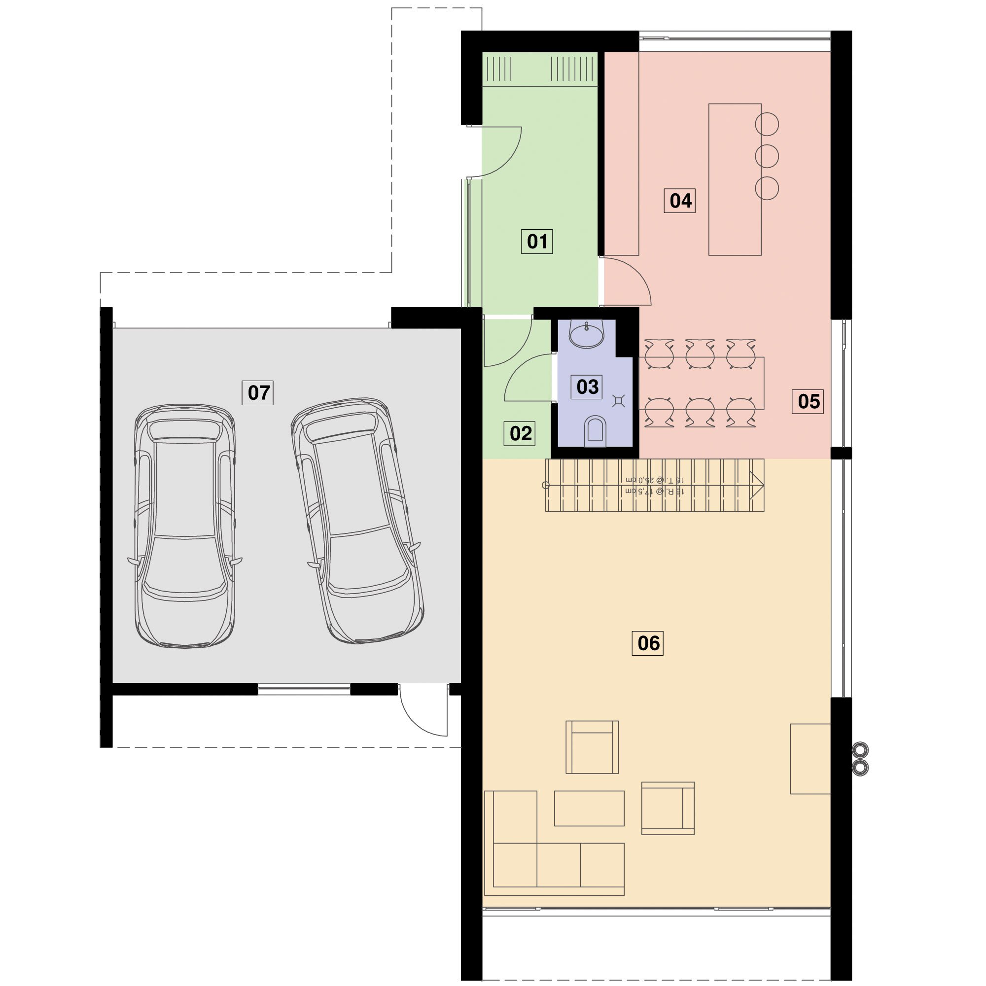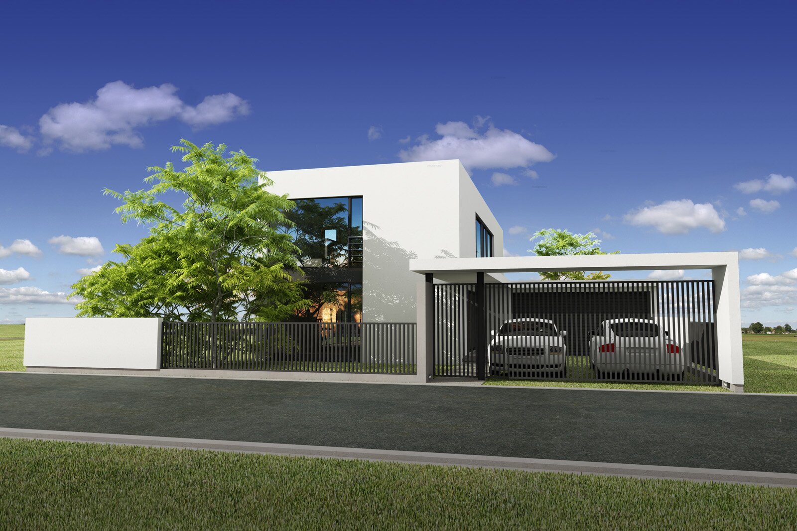 GJ-90-20 to jeden z budynków o bardzo nowoczesnej formie i bardzo dobrych parametrach cieplnych oraz tani w budowie. Zaprojektowaliśmy go z myślą o młodych ludziach potrzebujących dużo otwartej przestrzeni w części dziennej na parterze. Na piętrze znajdują się trzy sypialnie jedna duża i dwie mniejsze. Duża sypialnia posiada odrębną przestronną łazienkę. Budynek może mieć pojedynczy (-G1) lub podwójny (-G2)garaż. Przed Garażem zaprojektowana wiata osłaniająca wejście do budynku. Ogromne szyby z salonu na ogród dają efekt dużej przestrzeni i swobody. Na całej szerokości obiektu usytuowano pokój dzienny z otwartą kuchnią i jadalnią. Budynek ma bardzo dobre parametry energetyczne uzyskane przy bardzo niskich kosztach budowy Uk 0,18. Ściany w systemie pustaka ceramicznego lub komórkowego, ocieplenie 15 cm styropianem lub wełną mineralną, dach płaski z membraną Firestone.