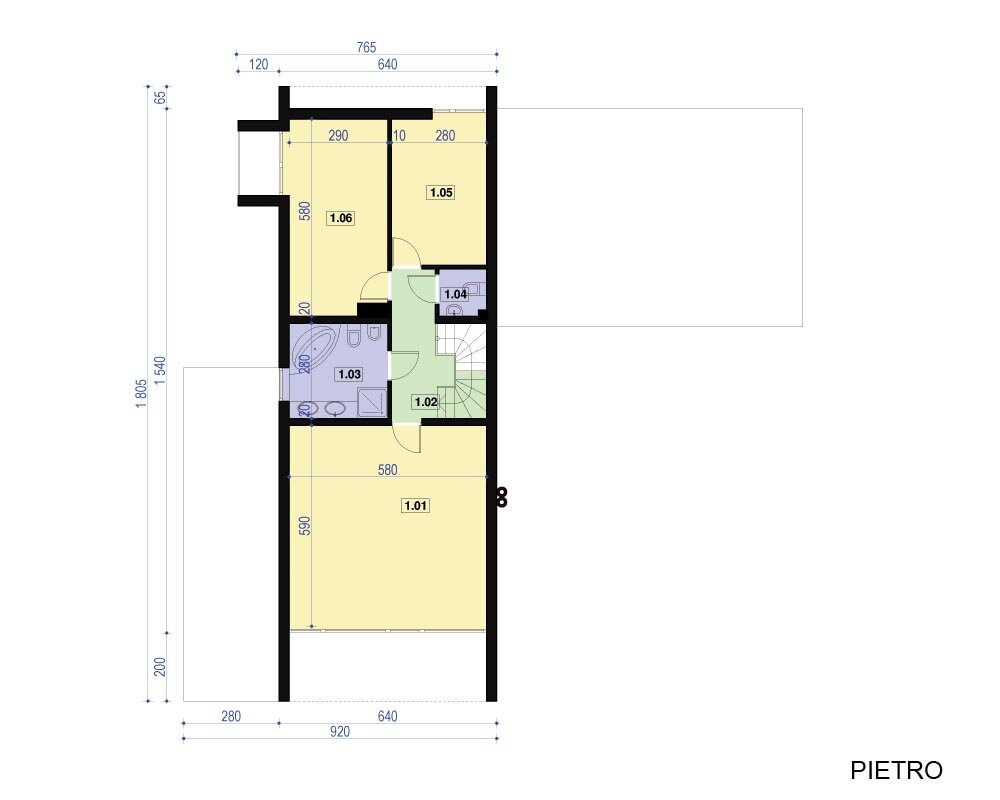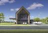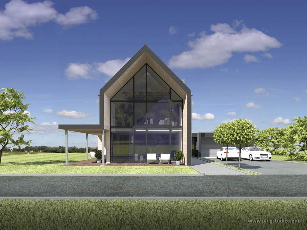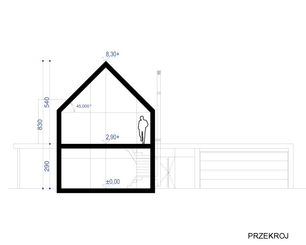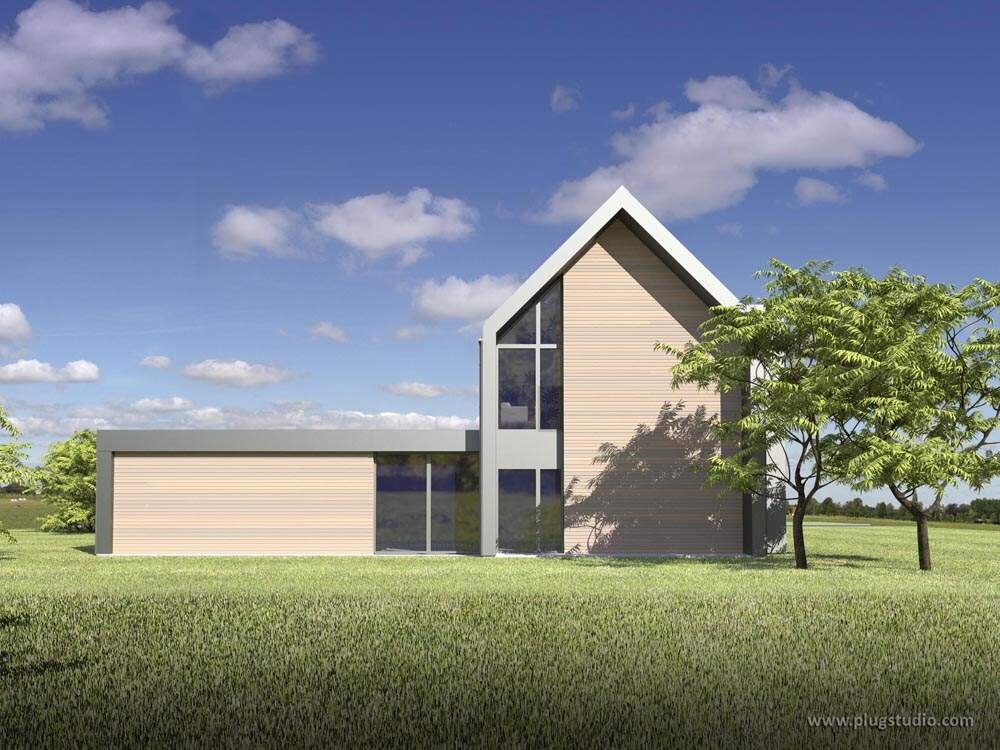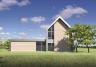 Projekt tzw. "nowoczesnej stodoły" - dom jednorodzinny z dachem dwuspadowym. Wysokość 8.30 m, dostępne są również wersje 7.60 lub 6.20 m. Na parterze otwarta przestrzeń salonu z kuchnią, dobrze doświetlona poprzez szklaną scianę od strony tarasu. Na piętrze zaprojektowano 3 pokoje, łazienkę i wc. Ta wersja posiada również garaż na dwa samochody. W ofercie mamy dostępne różne wersje, w zależności od usytuowania budynku względem stron świata - salon z tarasem może być zlokalizowany od strony wejścia, jak w tym projekcie, albo z tyłu domu. Garaż jest częsią ruchomą, może być osobno lub połączony z budynkiem stodoły. Projekty różnią się wielkością, ich szerokość pozostaje taka sama, możemy dodać kolejne moduły - wtedy budynek będzie dłuższy.