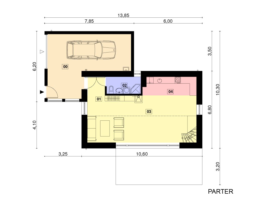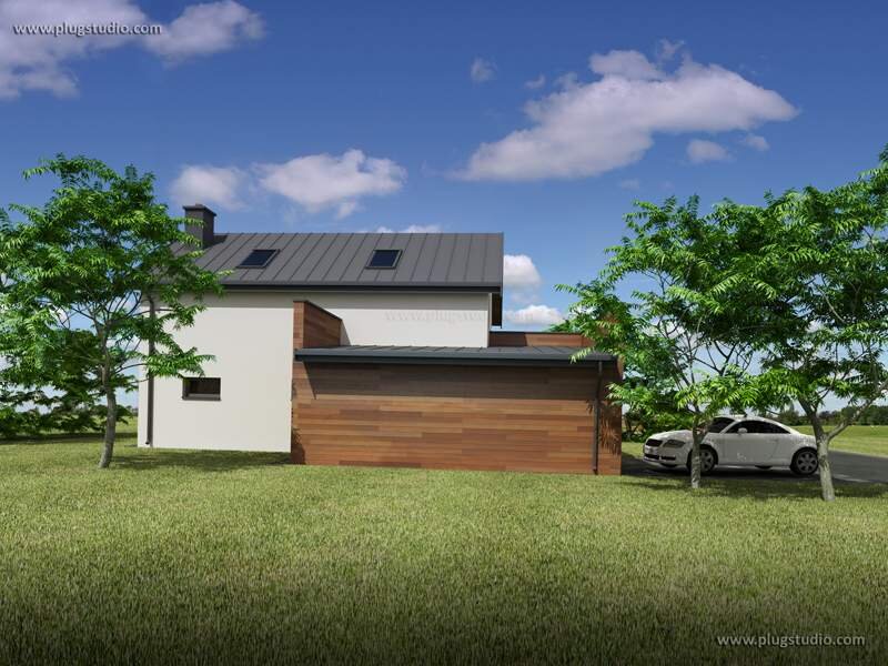 Projekt niewielkiego domku z antresolą. Garaż dla samochodu jednostanowiskowy. Dom przeznaczony dla 3 osób. autor: Grzegorz Olesch PLUG STUDIO Wizualizacje: Rzuty: