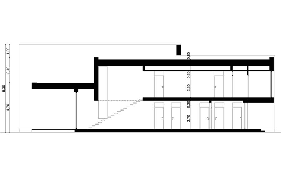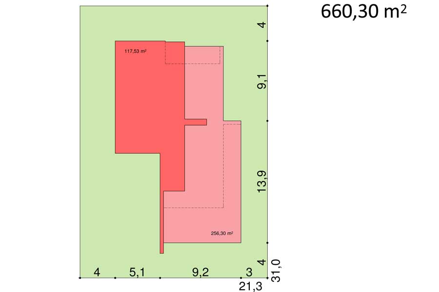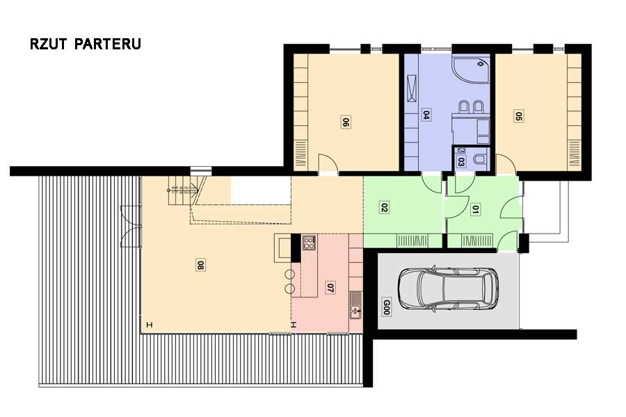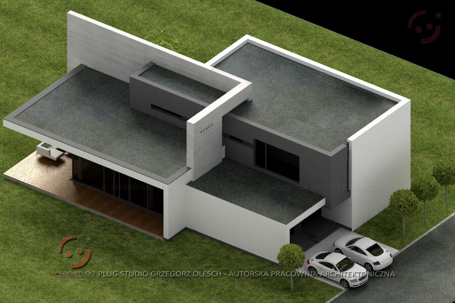 Jeden z projektów serii EVO. Bardzo odważna bryła budynku buduje wizerunek właściciela. Od frontu niedostępny i ascetyczny w formie. W środku duża otwarta na ogród przestrzeń dzienna. Możliwa jest wersja z garażem na 2 stanowiska jak i wersja lustrzana.