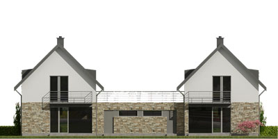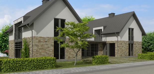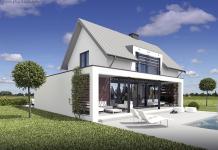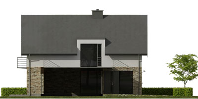 Jest to jeden z budynków o bardzo współczesnej formie i niezmiernie dobrych parametrach cieplnych. Zaplanowaliśmy go z myślą o młodych inwestorach potrzebujących dużej przestrzeni w strefie dziennej na parterze. Na piętrze mieszczą się trzy sypialnie jedna rozległa i dwie mniejsze. Duża sypialnia zawiera odrębną przestronną łazienkę. Ogromne okna z salonu na ogród nadają efekt ogromnej przestrzeni i swobody. Na całej szerokości obiektu zaplanowano pokój dzienny z otwartą kuchnią i jadalnią.