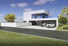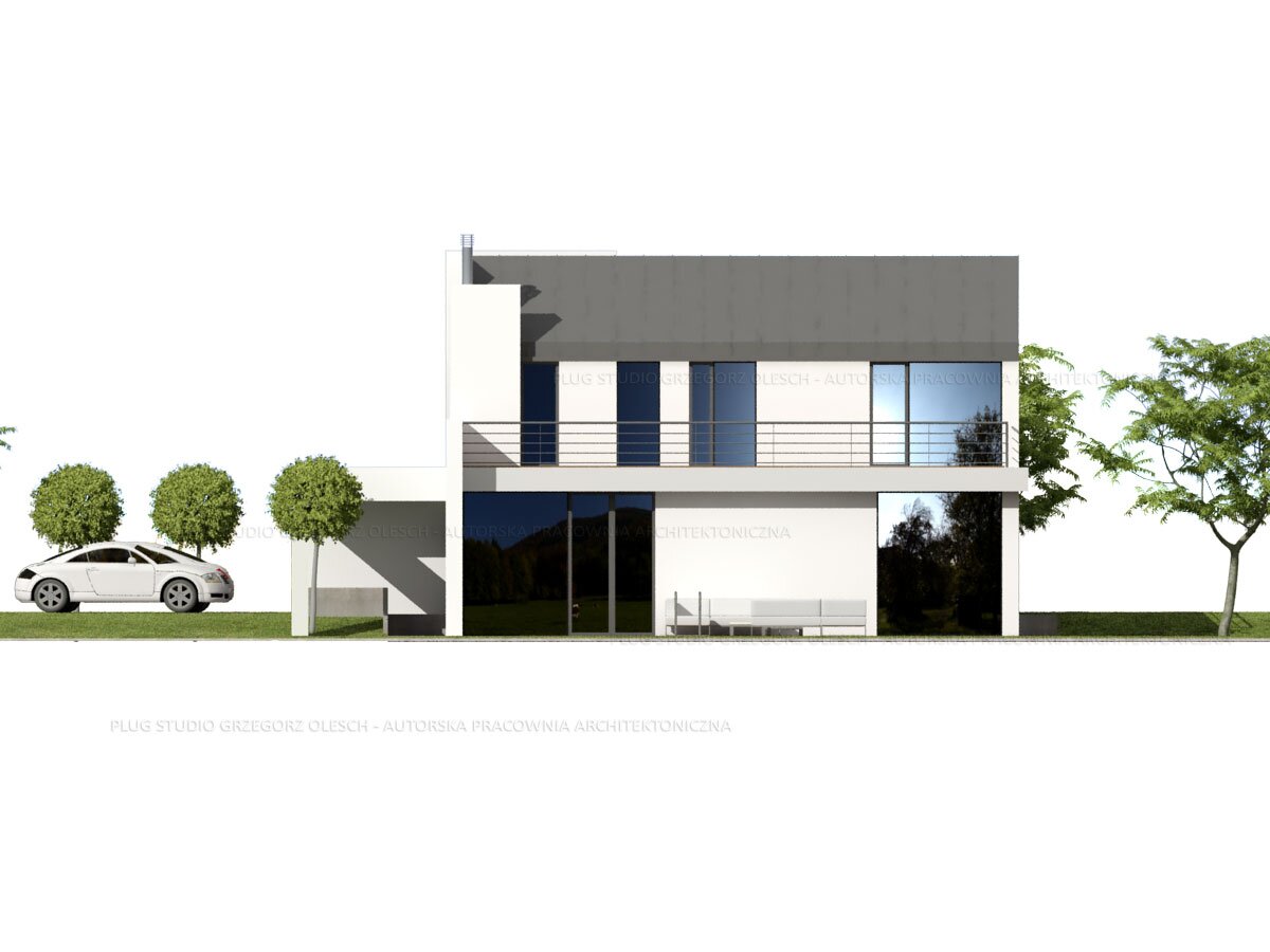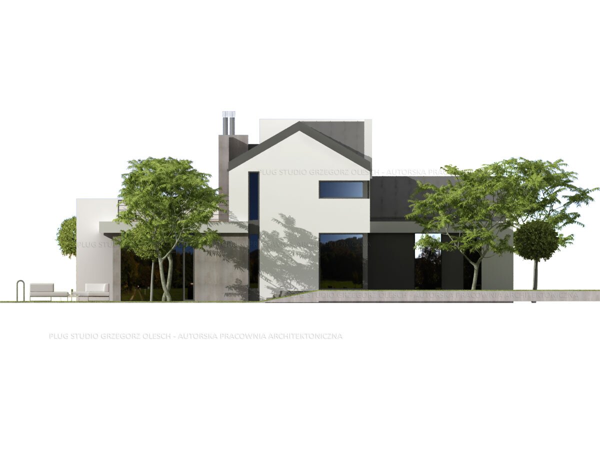Projekt domu jednorodzinnego z ukrytym spadzistym dachem. Autor: Grzegorz Olesch Plug Studio Wizualizacje: Rzuty:
