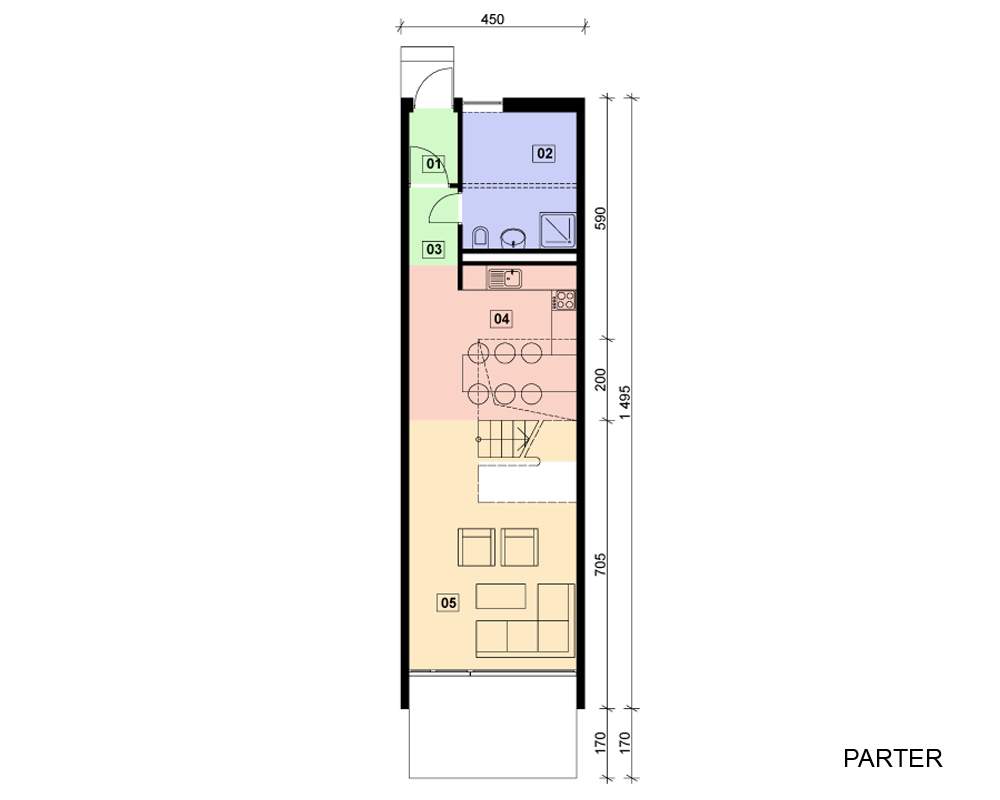 Najmniejszymoduł w zabudowie szeregowej serii LONGER. Minimalna szerokość działki to zaledwie 4.5 m, dzięki czemu idealnie sprawdzi się na działkach długich i wąskich. Projekt pozwala na uzyskanie bardzo wysokiej intensywności zabudowy. Dysponujemy całym systemem tego typu projektów dla szerokości działek 4.0-12.0 m i głębokości 8.0-26.0 m oraz różnymi typami dachów.