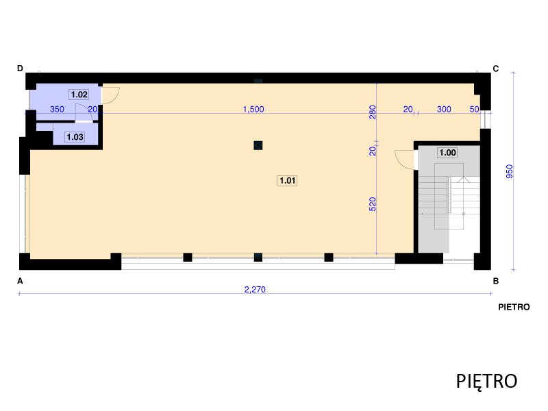 Na piętrze zaprojektowano otwartą przestrzeń oraz pomieszczenie techniczne.