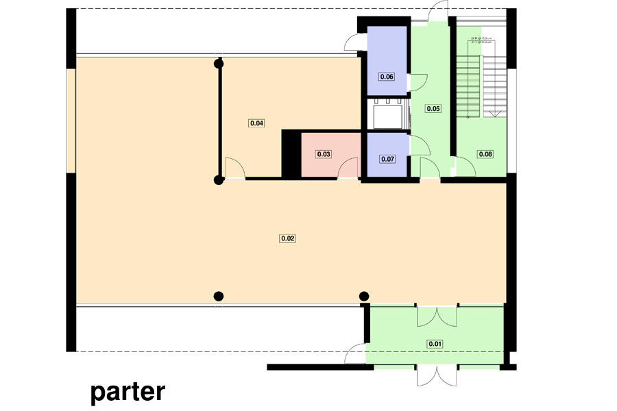 Projekt budynku usługowo - biurowego, do dowolnej adaptacji na odpowiednią funkcję w zależności od potrzeb klienta. Na parterze znajduje się jednoprzestrzenne pomieszczenie, oraz część sanitarno - socjalna z komunikacją na piętro. System konstrukcyjny pozwala na dowolny podział pomieszczeń. Budynek idealnie nadaje się do zabudowy w aglomeracji miejskiej, jak również na obrzeżach miast, przy halach fabrycznych. Dostępne inne wersje budynku - z dodatkowym piętrem, a także mniejsze, większe, z garażem oraz możliwoscią dostawienia do istniejących hal fabrycznych, produkcyjnych, magazynowych.