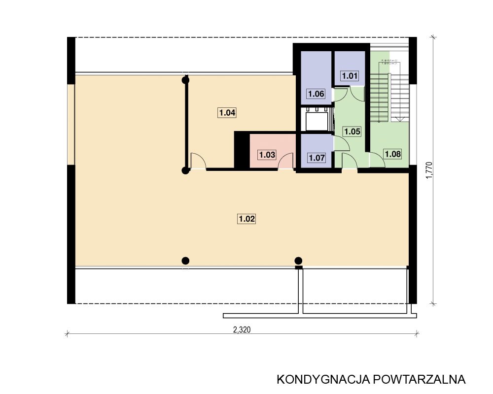 Projekt budynku usługowego - biurowego, do dowolnej adaptacji na odpowiednią funkcję w zależności od potrzeb klienta. Na parterze znajduje się jednoprzestrzenne pomieszczenie, oraz część sanitarno - socjalna z komunikacją na piętro. System konstrukcyjny pozwala na dowolny podział pomieszczeń. Budynek idealnie nadaje się do zabudowy w aglomeracji miejskiej, jak również na obrzeżach miast, przy halach fabrycznych. Dostępne inne wersje budynku pomniejszona o jedno piętro a także wersje mniejsze, większe, z garażem oraz możliwoscią dostawienia do istniejących hal fabrycznych, produkcyjnych, magazynowych.