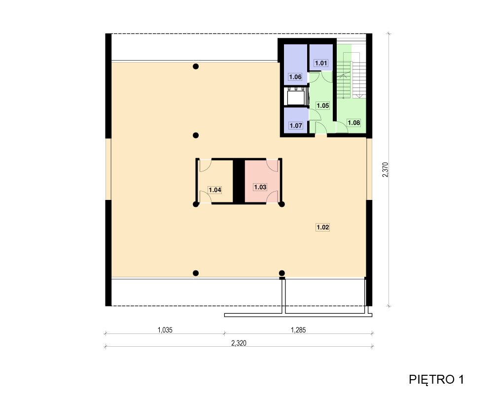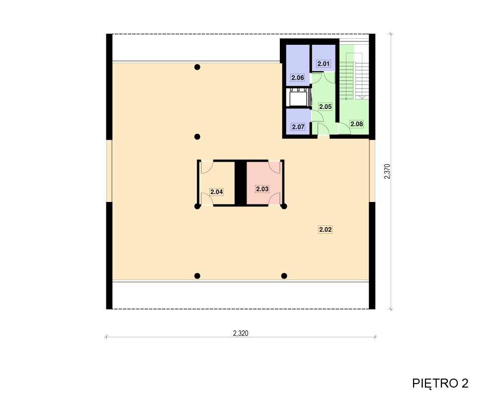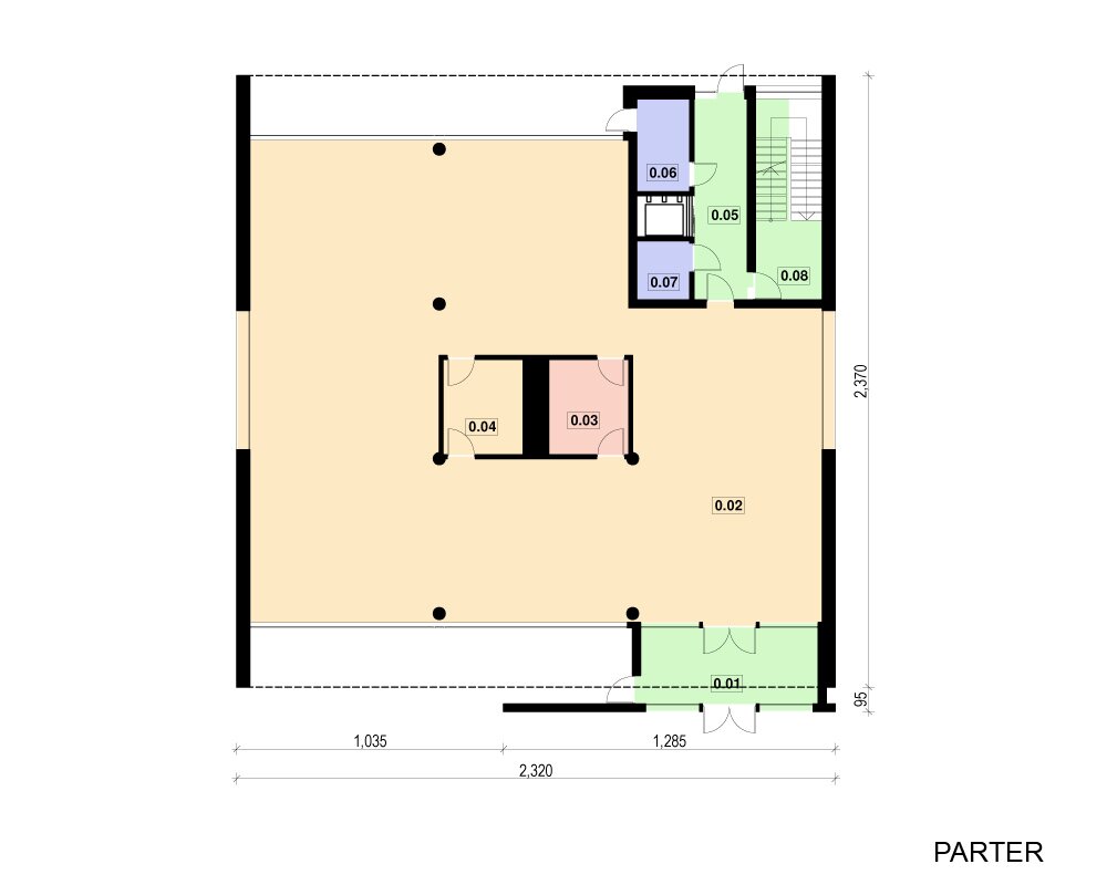 Projekt budynku usługowego - biurowego, do dowolnej adaptacji na odpowiednią funkcję w zależności od potrzeb klienta. System konstrukcyjny pozwala na dowolny podział pomieszczeń. Budynek idealnie nadaje się do zabudowy w aglomeracji miejskiej, jak również na obrzeżach miast, przy halach fabrycznych. Dostępne różne wersje budynku, także z garażem oraz możliwoscią dostawienia do istniejących hal fabrycznych, produkcyjnych, czy magazynowych.