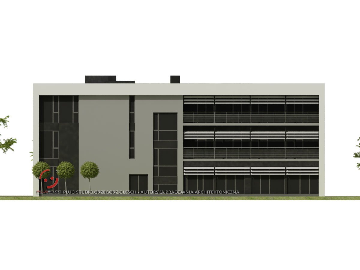Projekt budynku biurowego lub usługowego z garażem podziemnym.